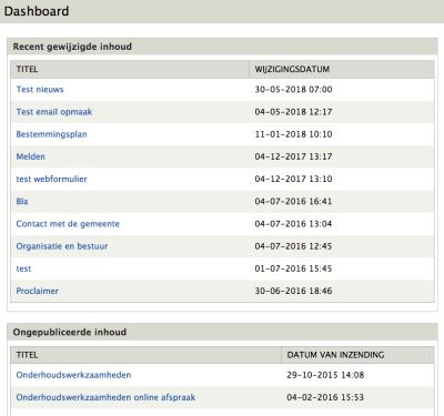 Op het dashboard vind u standaard de pagina's terug die het laatst gewijzigd zijn en de pagina's die niet gepubliceerd zijn. Maar uitbreidingen kunnen hier ook extra inhoud aan toevoegen zoals een overzicht met openstaande betalingen, of een overzicht met gebroken links.