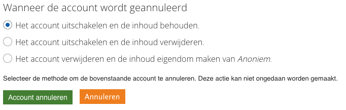 Nu kunt u kiezen wat er moet gebeuren met de inhoud die deze gebruiker toegevoegd heeft. Maak een keuze en klik dan op “Account annuleren”.