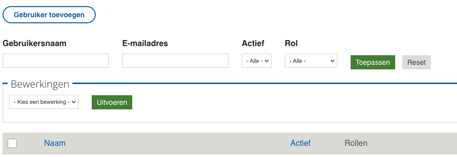 Hier zoekt u in de lijst de gebruiker op die u wil bewerken. Het is mogelijk de lijst te filteren op gebruikersnaam, e-mailadres, rol of status. Als u de gebruiker gevonden heeft, klikt u op “Bewerken” aan het eind van de bewuste regel. U krijgt dan hetzelfde scherm als bij het aanmaken van de gebruikers, alleen met de gegevens van de huidige gebruiker ingevuld. Pas de zaken die gewijzigd moeten worden aan, en klik onderaan het formulier op “Opslaan”.