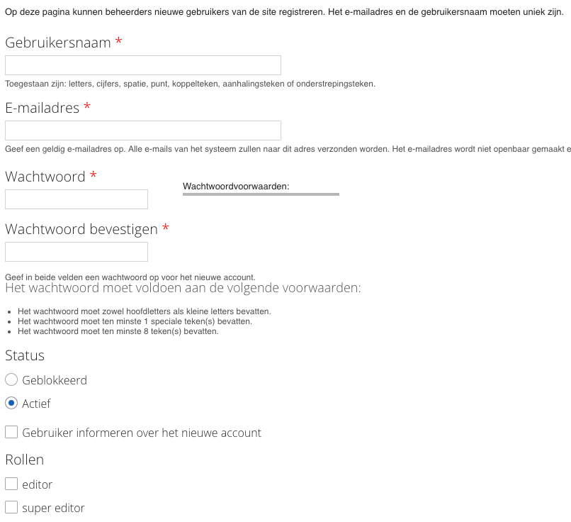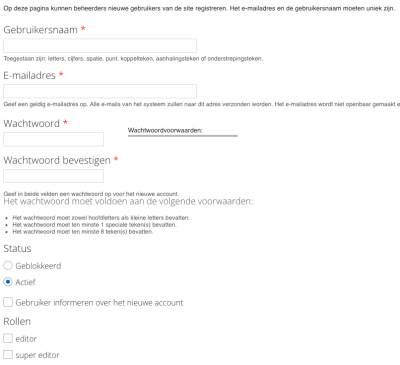 Vul hier een gebruikersnaam en e-mail adres in. Deze moeten uniek zijn. Kies een wachtwoord dat veilig is, of stel een heel ingewikkeld wachtwoord in, en laat de gebruiker de eerste keer dat hij in wil loggen via de optie “Nieuw wachtwoord aanvragen” een eigen wachtwoord instellen.