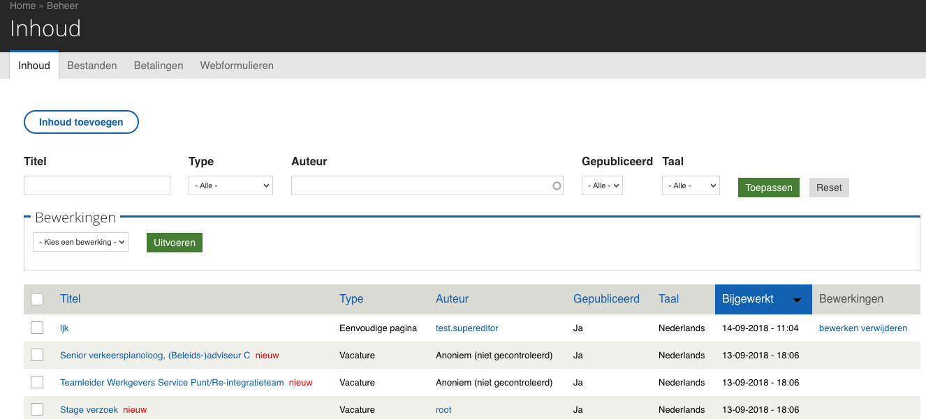 Het tabblad inhoud is de toegang tot de inhoud van uw site. Het is mogelijk om verschillende soorten inhoud te creëren en toe te voegen aan de website. Hier kunt u ook eenvoudig zoeken naar een pagina door bijvoorbeeld (een deel van) de titel, of de auteur in te vullen, of door te filteren op een bepaald inhoudstype. Ook kunt u filteren op wel of niet gepubliceerde inhoud.