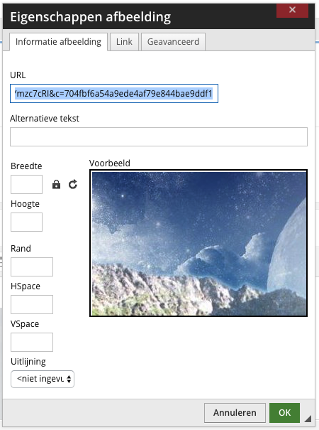 Daar kunt u bijvoorbeeld een link aan de afbeelding toevoegen. Kies daarvoor het tabblad 'Link' en vul de URL in. Kies ook hoe de link moet openen. In termen van toegankelijkheid is het belangrijk dat de link opent in hetzelfde venster ('Zelfde venster (_self)').