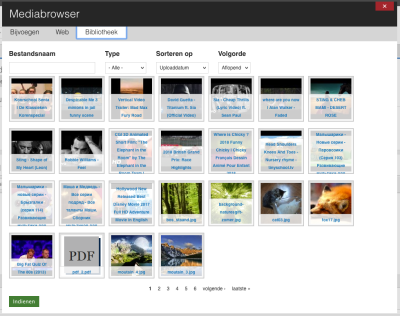 Klik hier op 'Bibliotheek' om een reeds geüpload bestand te gebruiken. Filter hier bijvoorbeeld op type, zoek op naam, sorteer op uploaddatum of gebruiksfrequentie (en bepaal de volgorde hiervan).