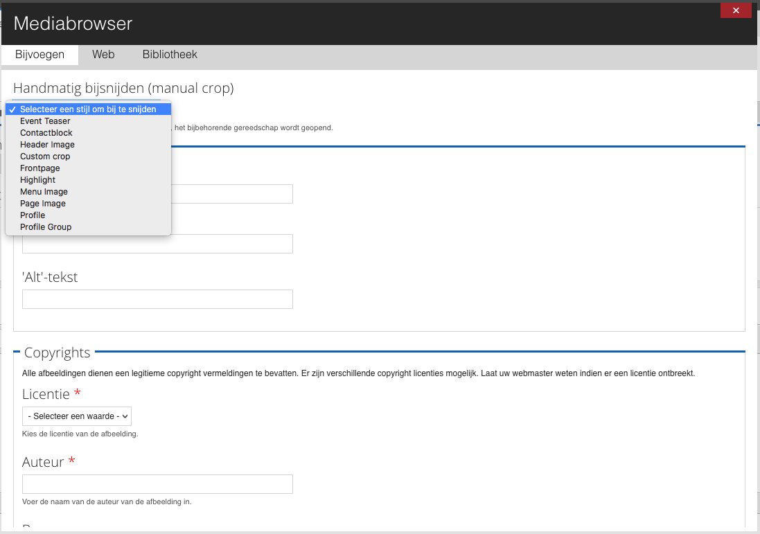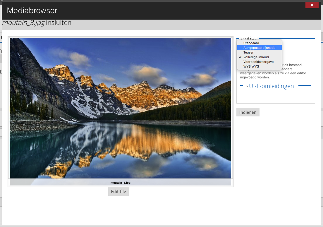 Selecteer het item dat u wilt invoegen en klik op “Indienen”. Bij het toevoegen van een afbeelding via deze weg krijgt u de vervolgvraag hoe de afbeelding weer te geven. Dit zijn voorgedefinieerde formaten (bijvoorbeeld een teaser, voorbeeldweergave of de standaard grootte), waarvan u de uitsnede hebt ingesteld bij het uploaden van de afbeelding. Als de uitsnede niet corrrect is, kunt u dit wijzigen door de afbeelding te bewerken. Klik daarvoor onder de afbeelding op de knop “Edit file”.
