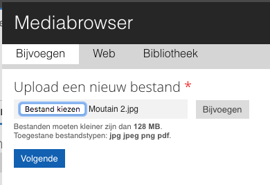 Om een nieuw bestand te plaatsen opent u ook de Media browser, en selecteert u op het eerste tabblad een bestand op uw computer.