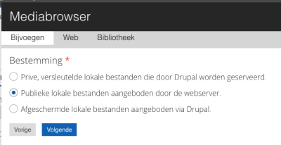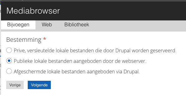 Kies nu op welke manier u een afbeelding wil opslaan. Gebruik hier altijd de instelling “Publieke lokale bestanden”. Afbeeldingen en bestanden die u op een pagina plaatst moeten bereikbaar zijn voor de gebruiker van de pagina, dus moeten ze publiek zijn. Klik op “Volgende” om door te gaan.
