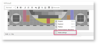 Wanneer een afbeelding reeds is toegevoegd, zijn de voorgaande media-eigenschappen (weergave formaat) nog steeds te benaderen. Klik hiervoor met de rechtermuisknop op de afbeelding en selecteer 'Media settings':