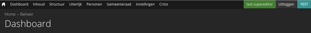 Nadat u bent ingelogd, verschijnt er bovenin de website een zwarte balk met verschillende menu items. Met deze menu items kunt u onder andere de inhoud van de website beheren. De verschillende koppen in deze menu-balk zullen hieronder worden toegelicht.