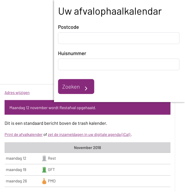 Met deze functionaliteit kan een afvalkalender weergegeven worden op de website. Een gebruiker kan zijn of haar postcode invullen en ziet dan wanneer de verschillende afvaltypen opgehaald worden. Deze kalender kan ook gedownload worden, in een agenda geplaatst als afspraken, of geprint worden. De postcode die een burger invult wordt op de lokale computer onthouden.