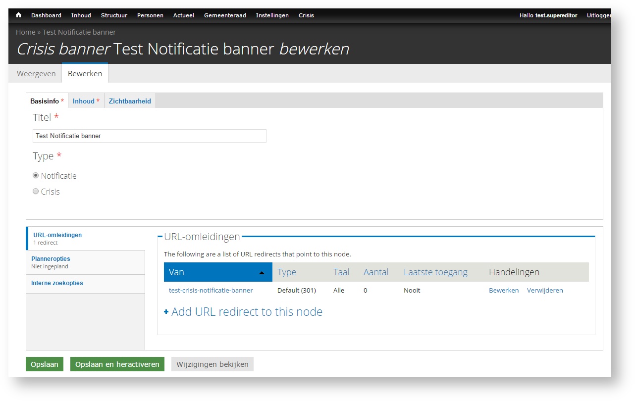 - Klik 'Opslaan' (klik op 'Opslaan en heractiveren' om de Crisis banner opnieuw te tonen indien deze binnen de huidige sessie is weggeklikt)