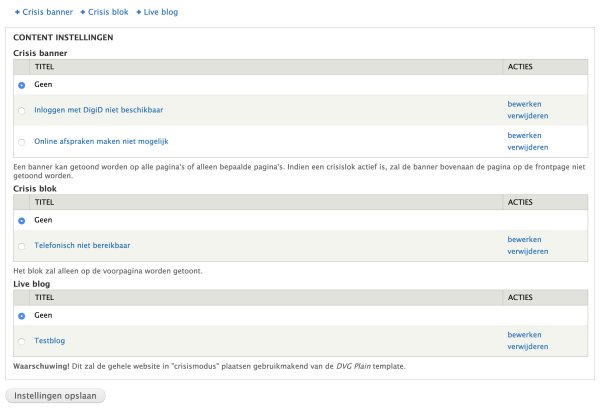 Met de DvG Crisisfunctionaliteit kunnen bezoekers van de website via verschillende 'crisisniveaus' gewaarschuwd worden. De 'Crisis banner' wordt vaak gebruikt voor het laagste crisisniveau en wordt standaard getoond bovenaan alle pagina's. Het 'Crisis blok' wordt vaak gebruikt voor een gemiddeld crisisniveau en wordt altijd prominent en opvallend getoond op de homepage. Het 'Live blog' wordt gebruikt voor een hoog crisisniveau. Bij activeren wordt de gehele site in crisismodus geplaatst.