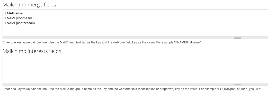 - Hetzelfde geld voor interesse-velden. Hier kan dan bijvoorbeeld Nieuwsbrieven|nieuwsbrieven komen te staan. “Nieuwsbrieven” verwijst dan naar hoe het in mailchimp is genoemd. “nieuwsbrieven” verwijst dan naar de form key van het keuzeveld in het CMS.