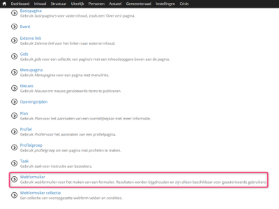 1. Log in als 'supereditor' via URL/user 2. Hover over 'inhoud' en klik op 'Inhoud toevoegen'. 3. Kies vervolgens voor 'Webform' onderaan de pagina: