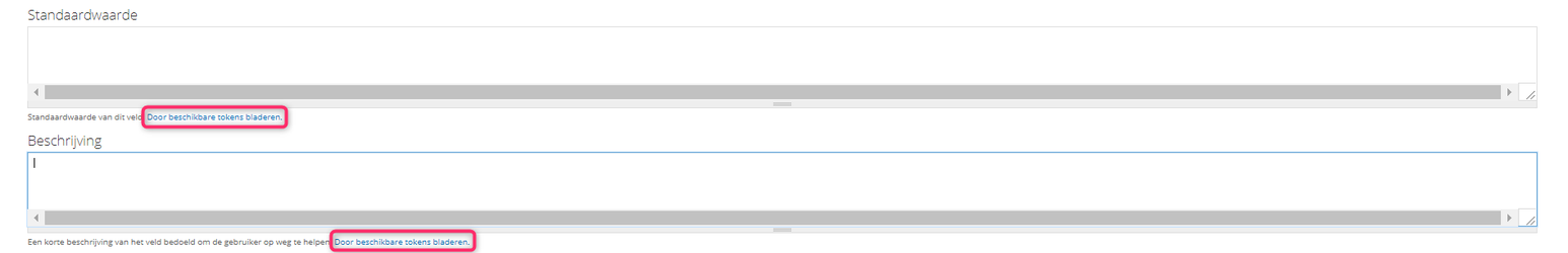 werken met tokens in de hulptekst ('Beschijving') en het veld 'Standaard waarde'