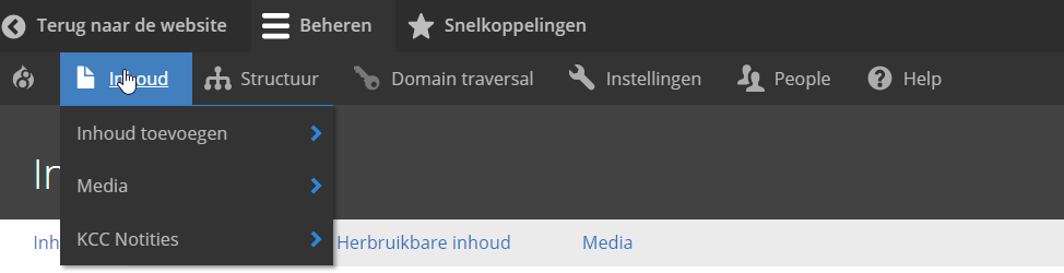 Voeg inhoud toe via de zwarte menubalk→ Inhoud→ Inhoud toevoegen of media toevoegen.