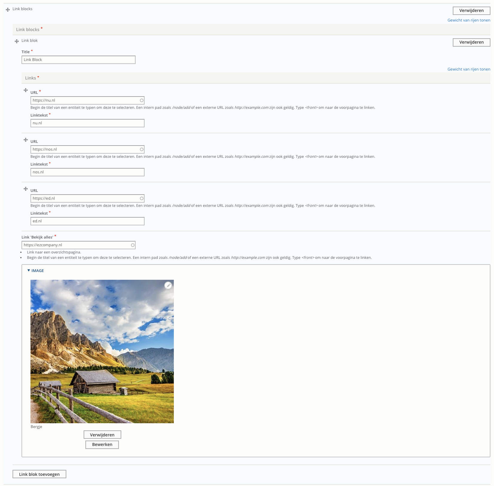 Links-blokken zijn blokken met een titel, een plaatje en 3 interne of externe links. Daarnaast staat onderin het blokje een link naar “Bekijk alles”, die verwijst naar een interne of externe pagina die u kunt definiëren.