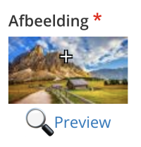 In het voorbeeldplaatje ziet u een klein wit kruisje. Dit is het zogenoemde “Focuspunt”. Een afbeelding wordt op de website in allerlei verschillende formaten gebruikt. Bijvoorbeeld langwerpig als header afbeelding boven een pagina, maar klein en vierkant op een verzamelpagina met allemaal profielen. Om ervoor te zorgen dat de afbeelding er in alle verschillende uitsnedes mooi uitziet plaatst u het focuspunt op het belangrijkste punt van de afbeelding. Klik op het “Preview”-knopje om een pagina te laden met voorbeelden van de uitsnedes die dan gemaakt worden. Deze “Preview”-pagina kan u weer sluiten. Daarna kan u het focuspunt verplaatsen en opnieuw op “Preview” klikken om het verbeterde resultaat te bekijken.