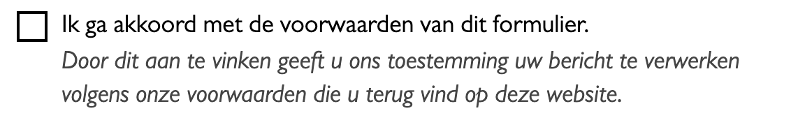 Een keuzevakje is een “vinkje”. Dit kan gebruikt worden om een toestemming af te dwingen. Voor een “groep” vinkjes gebruiken we het element “Keuzevakjes” in de groep “Optie-elementen”