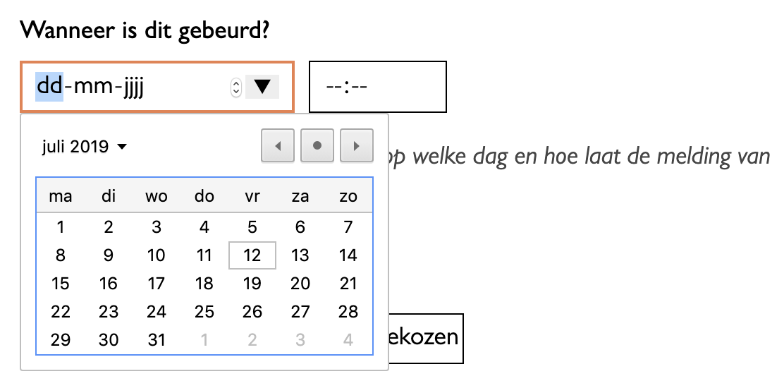 Voor het bevragen van data en tijden hebben we de datum en tijd elementen tot onze beschikking. Deze elementen kunnen alleen datum, alleen tijd of zowel datum als tijd bevragen. Bij het bevragen van een datum kan gekozen worden voor verschillende kalenders. Bijvoorbeeld de standaard html-5 kalender of een Jquery-ui datepicker.