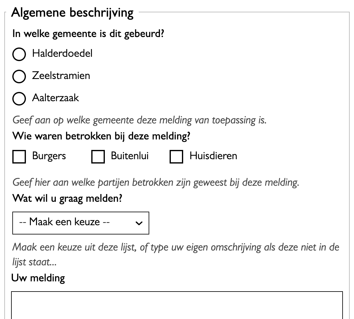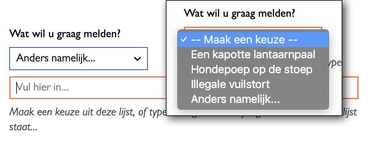 U kan een lijst met voorgedefinieerde keuzes aangeven, maar als de gebruiker ook de gelegenheid moet krijgen een eigen tekst toe te voegen als de optie er niet tussen staat, gebruikt u dit element. U kan zelf aangeven in welke vorm de “andere” optie ingegeven kan worden. Een enkele regel, een tekstveld of een getal.