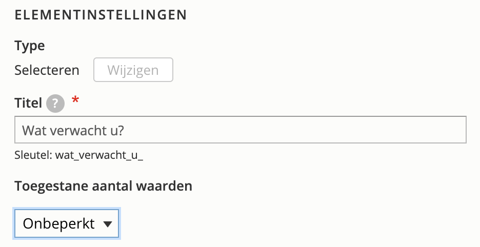 Als een gebruiker uit vele opties mag kiezen kunt u deze het beste in een lijst presenteren, een zogenaamde “pull-down”-lijst. U kan de gebruiker de mogelijkheid bieden om meerdere keuzes te maken. Stel dan bij het kopje “Elementinstellingen” bij “Toegestane waarden” in dat er een “Onbeperkt” aantal waarden geselecteerd mag worden, of vul in het tekstveld achter “Beperkt” een getal hoger dan 1 in.