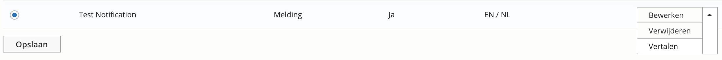 - Als er geen vertaling is toegevoegd aan de notificaties, zal bij alle talen de enige aanwezige taal getoond worden. Als er wel een vertaling is, zal de taal getoond worden waarop de bezoeker de site bezoekt.