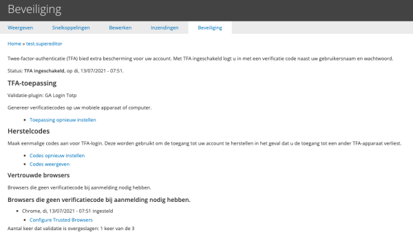 Op deze pagina kunt u het aantal validatiepogingen opnieuw instellen (zodat de gebruiker zijn TFA zelf in kan stellen). Of u kan de herstelcodes opnieuw genereren of bekijken zodat u de gebruiker een code kan geven om in te loggen en vervolgens zelf de TFA opnieuw te koppelen. U kan ook de volledige koppeling uitvoeren. Dan moet u wel de koppelcode aan de gebruiker doorgeven zodat deze die in kan voeren in de TFA-applicatie.