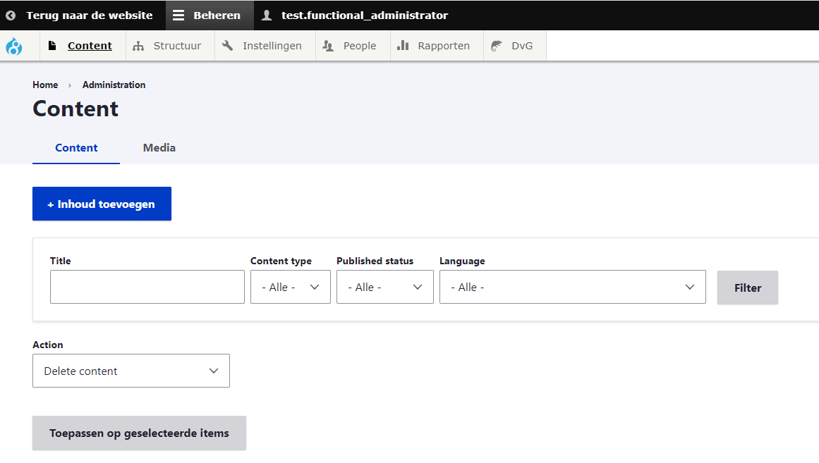 Hier kan inhoud worden toegevoegd zoals: pagina's, taken, en diverse media Bij 'Content' (inhoud) kunnen pagina's kunnen gepubliceerd en de-publiceerd. Bij 'Media' kunt u afbeeldingen, video en bijlagen beheren.
