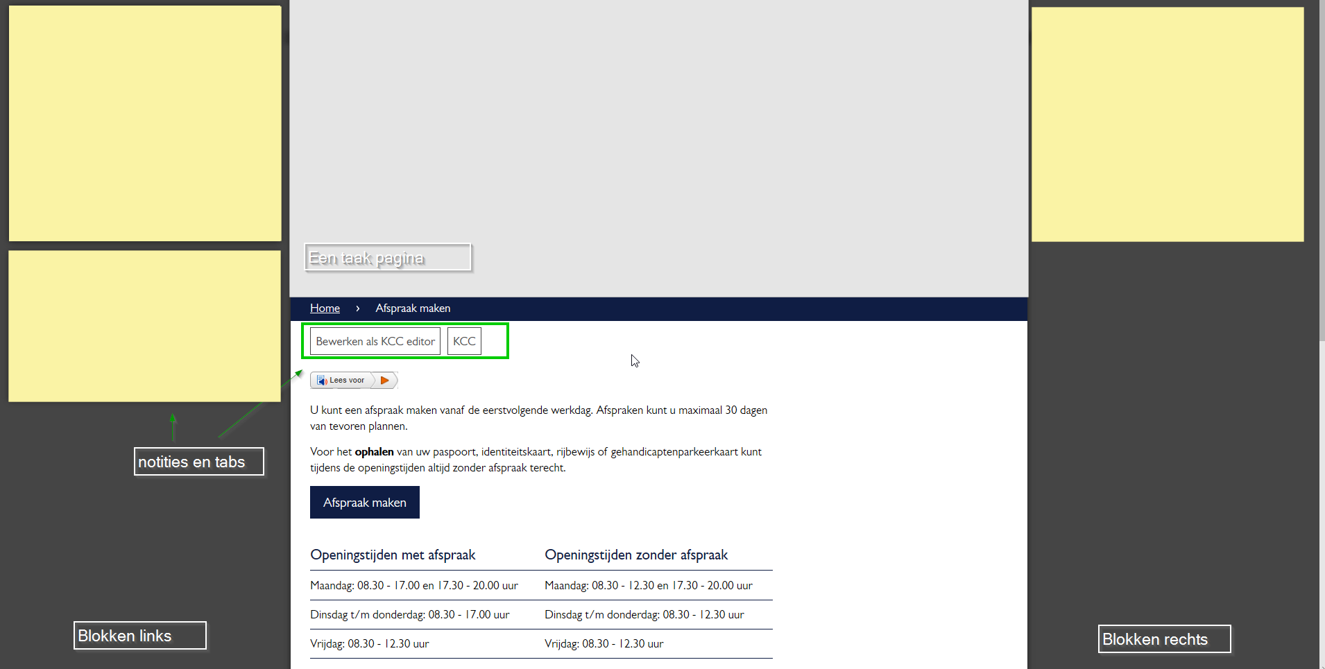 Ingelogde KCC-medewerkers krijgen extra informatie te zien in de vorm van blokken links en rechts en een extra tab op een taak pagina. De blokken links en rechts zien er uit als een soort gele plakbriefjes met notities. Dit kunnen handige links of e-mail adressen zijn, en er is de optie om suggesties in te sturen voor verbetering van de pagina.