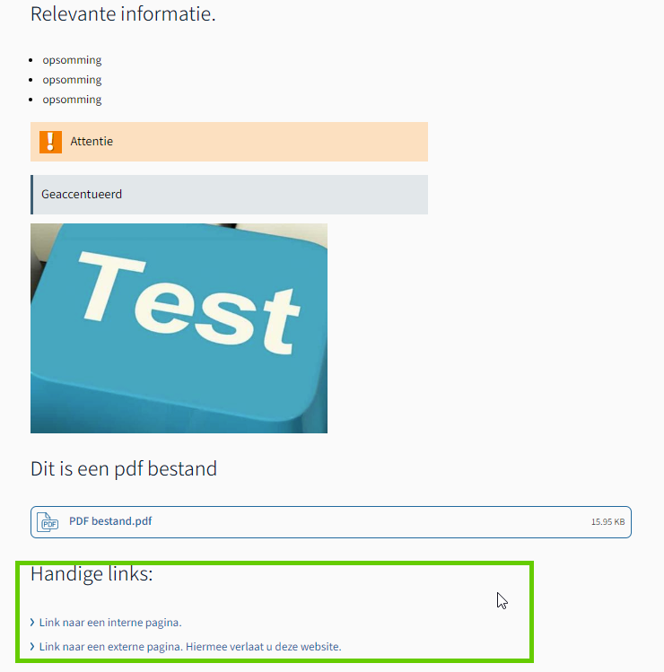 Ga naar een pagina, bijvoorbeeld een basispagina Hier voegt u een interne of externe link toe aan de pagina, die in een apart blokje op de pagina wordt getoond.