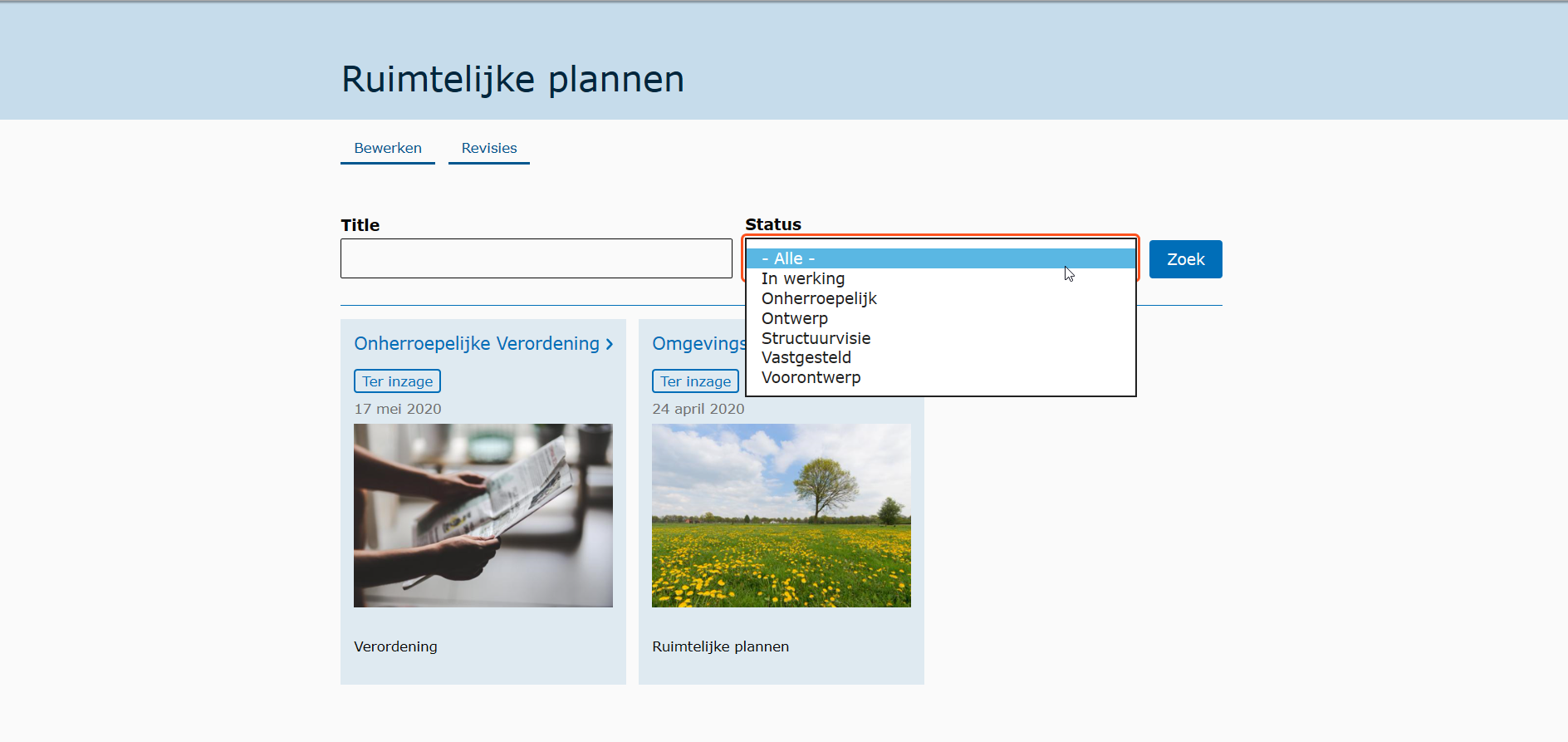 Plannen kunnen worden verzameld op een (basis) pagina, die een overzicht geeft van de ruimtelijke plannen. Op deze pagina kan gefilterd worden op titel en status van de plannen.