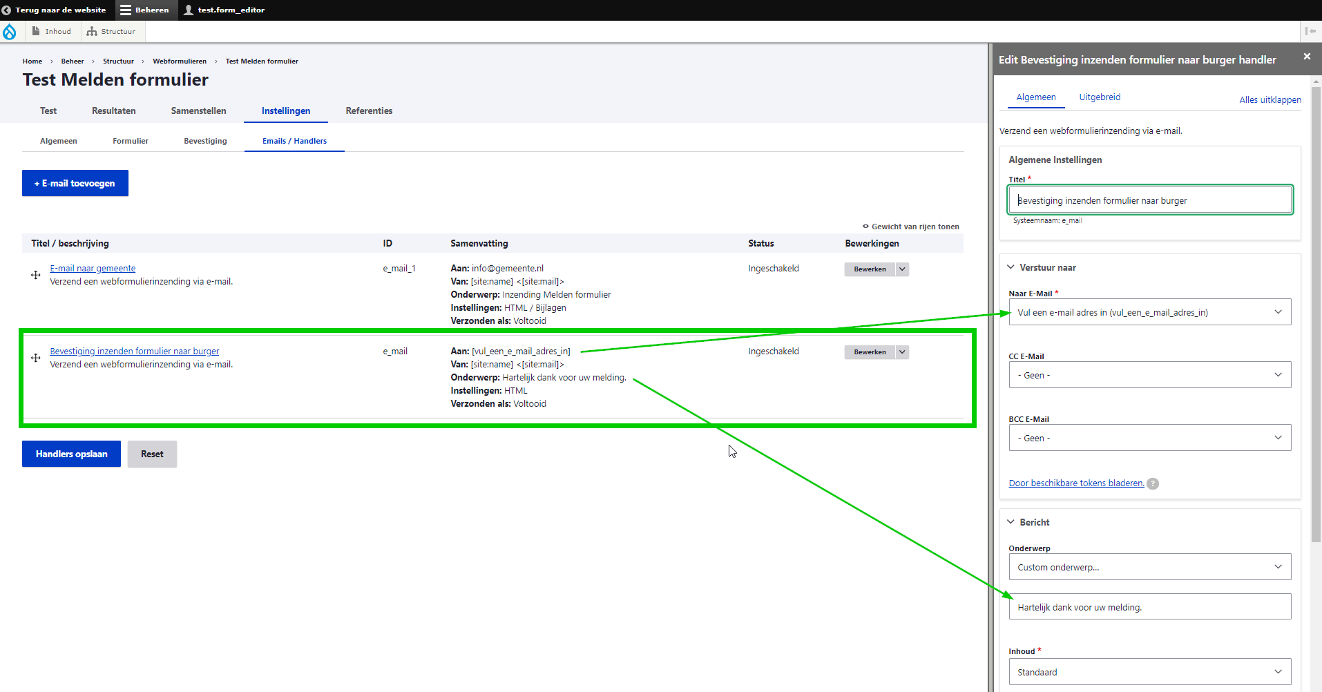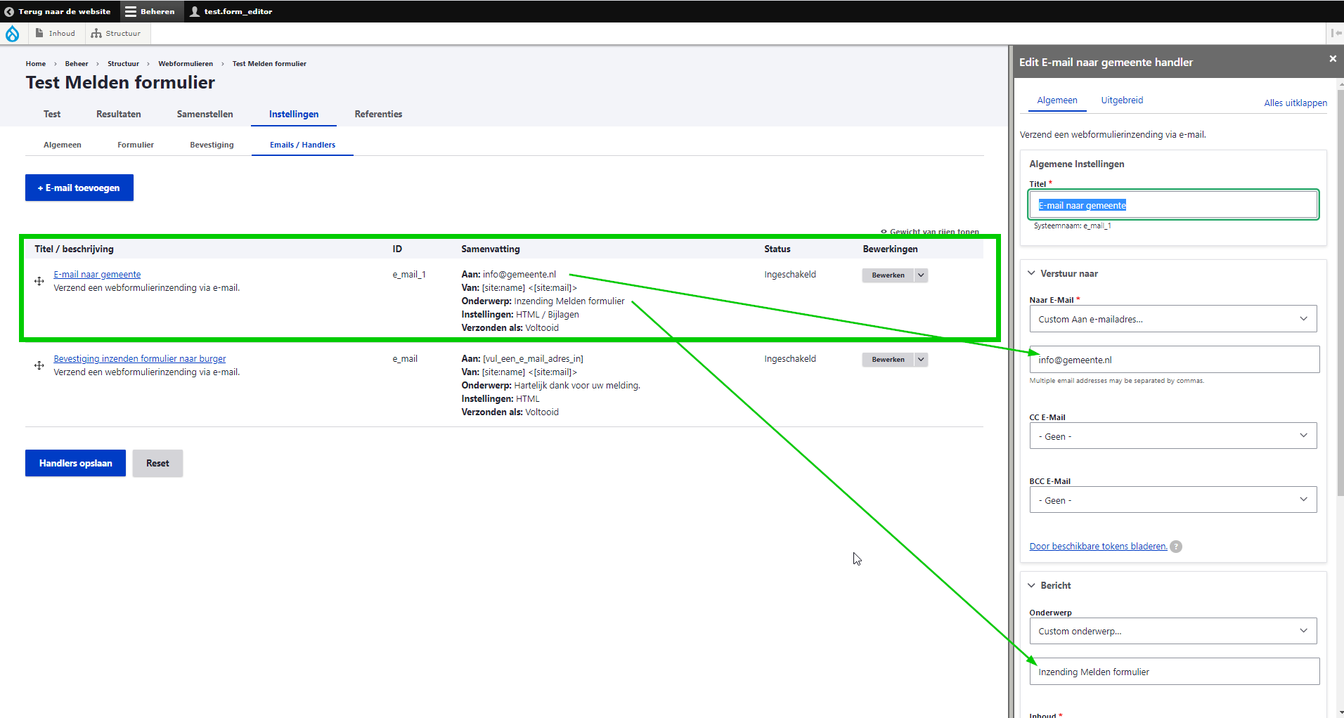 Sla ook het hele formulier op met 'Elementen opslaan'. - Om de e-mail instellingen te bewerken, ga naar → Instellingen→ e-mails/handlers.