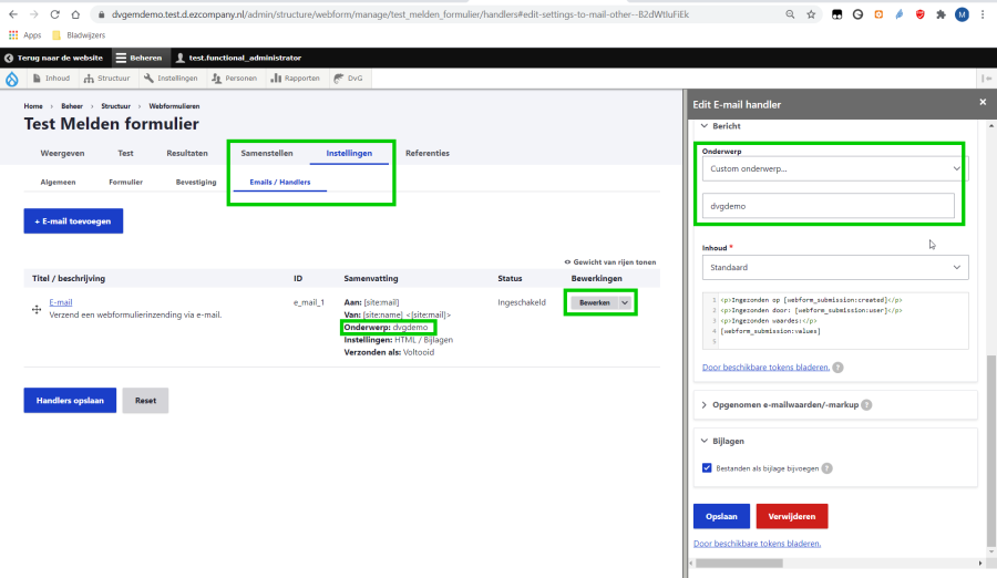 Sla ook het hele formulier op met 'Elementen opslaan'. - Om de e-mail instellingen te bewerken, ga naar → Instellingen→ e-mails/handlers.