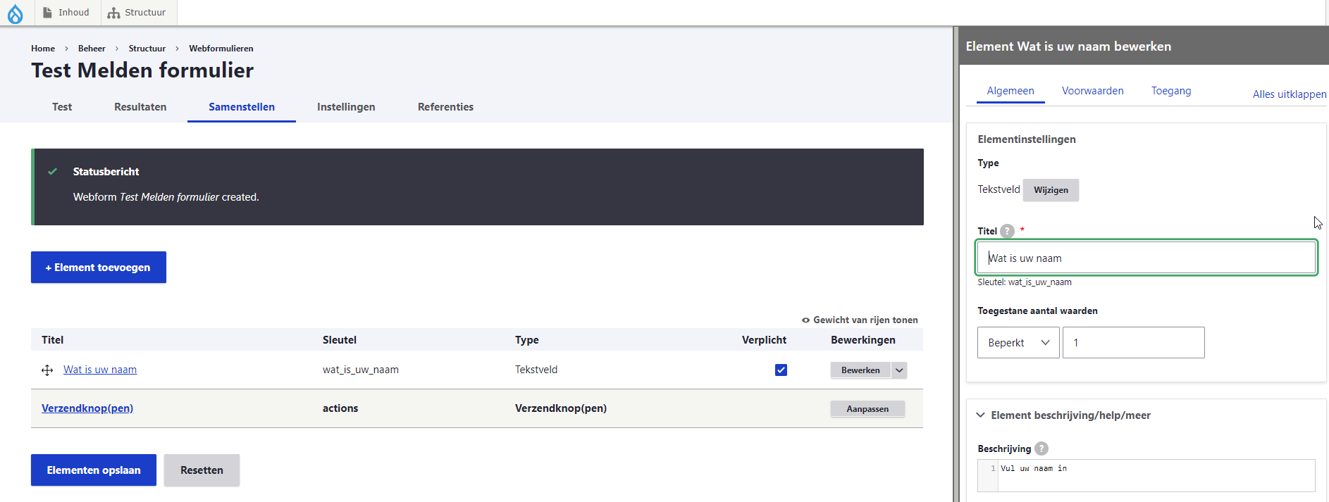 Voeg bij de elementen het type tekstveld toe. Aan de rechter kant verschijnt een extra venster waarin u het element in kan stellen. Zoals:
