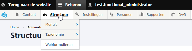 Onder structuur vindt u onder andere: menu's, taxonomieen en formulieren die actief zijn binnen de website. Elke optie heeft zijn eigen toepassingen, en wordt op een andere plek binnen de website gebruikt.