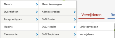Ga naar “Structuur > menus > DVG_header > link toevoegen”