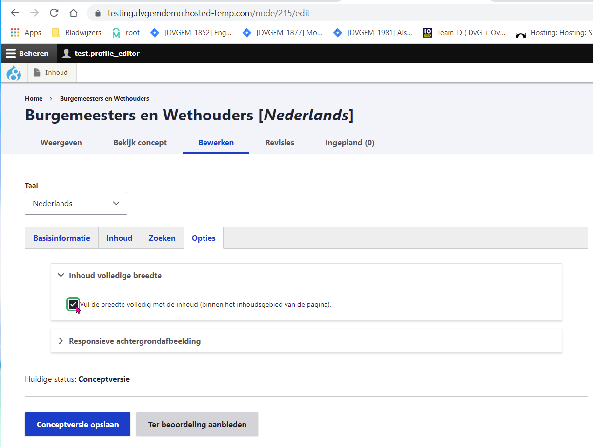Vul de verplichte velden in bij de tabbladen Basis, Inhoud, de overige tabbladen zijn optioneel.